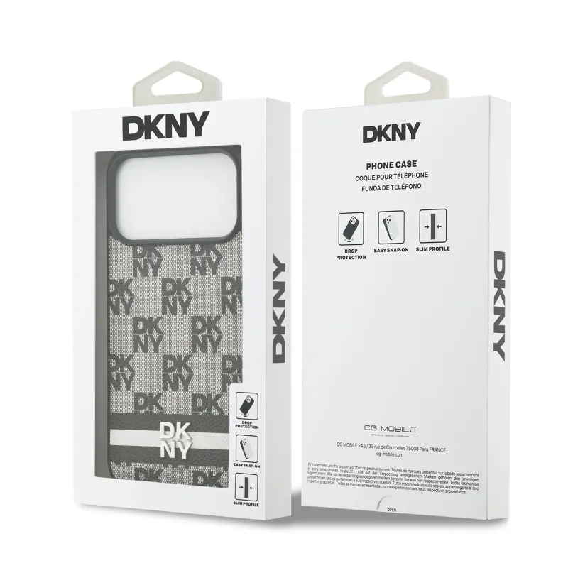 Prémiový zadní kryt DKNY PU Leather Checkered Pattern and Stripe se vyznačuje elegantním a charakteristickým vzorem, doplněným o kovové logo DKNY.