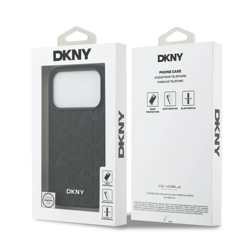DKNY PU Leather Grid Pattern Magsafe se skládá z opakovaného loga značky "DKNY", což vytváří elegantní grafický efekt.