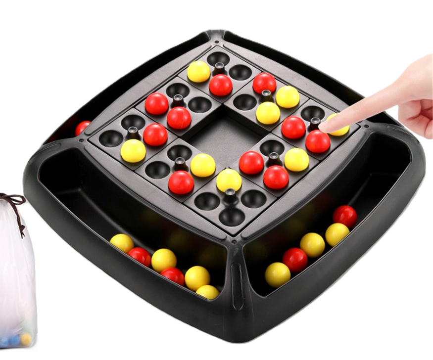 Tato dvojbarevná logická hra s kuličkami staví na jednoduchém principu kombinování dvou barev, který děti přirozeně vede k přemýšlení a hledání správného řešení. Kontrast červených a žlutých kuliček pomáhá snadno rozlišovat herní prvky a zároveň podporuje schopnost plánovat další tahy.