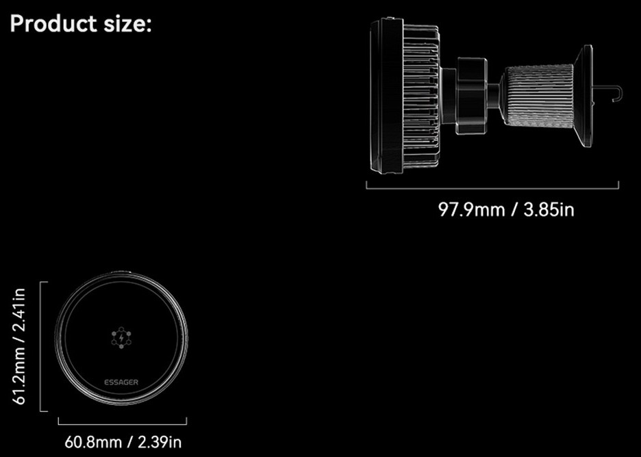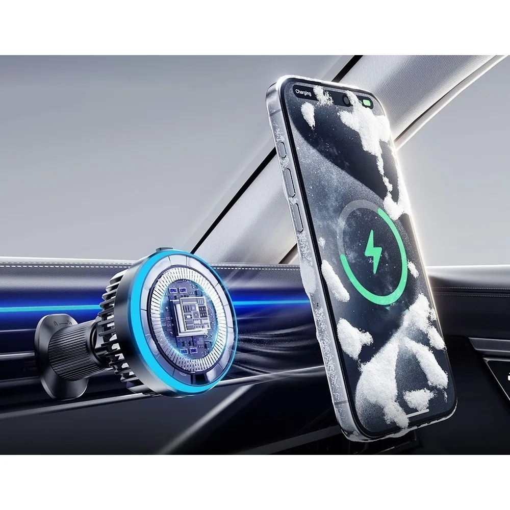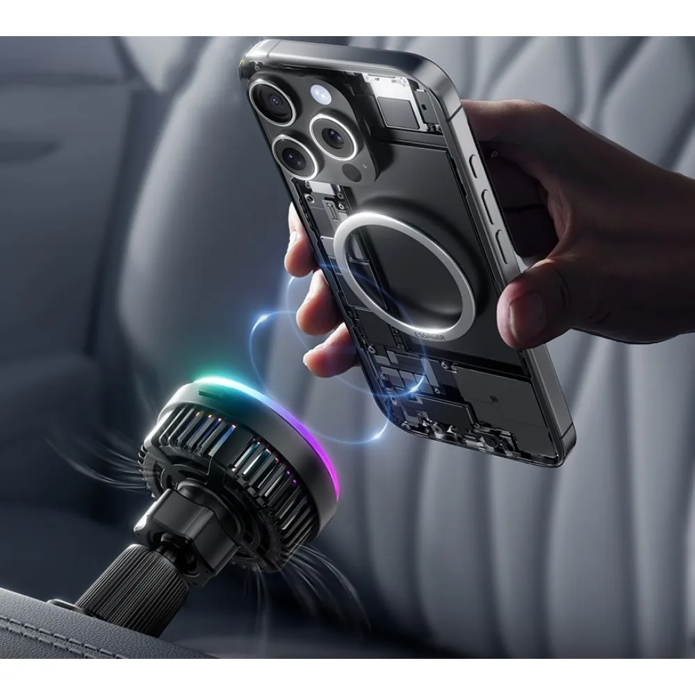 Essager magnetická bezdrátová nabíječka do auta 15W s chlazením a 360° rotací je moderní řešení pro pohodlné nabíjení telefonu během jízdy. Díky silnému magnetickému uchycení drží telefon pevně na místě a umožňuje snadné přichycení i odejmutí jednou rukou.