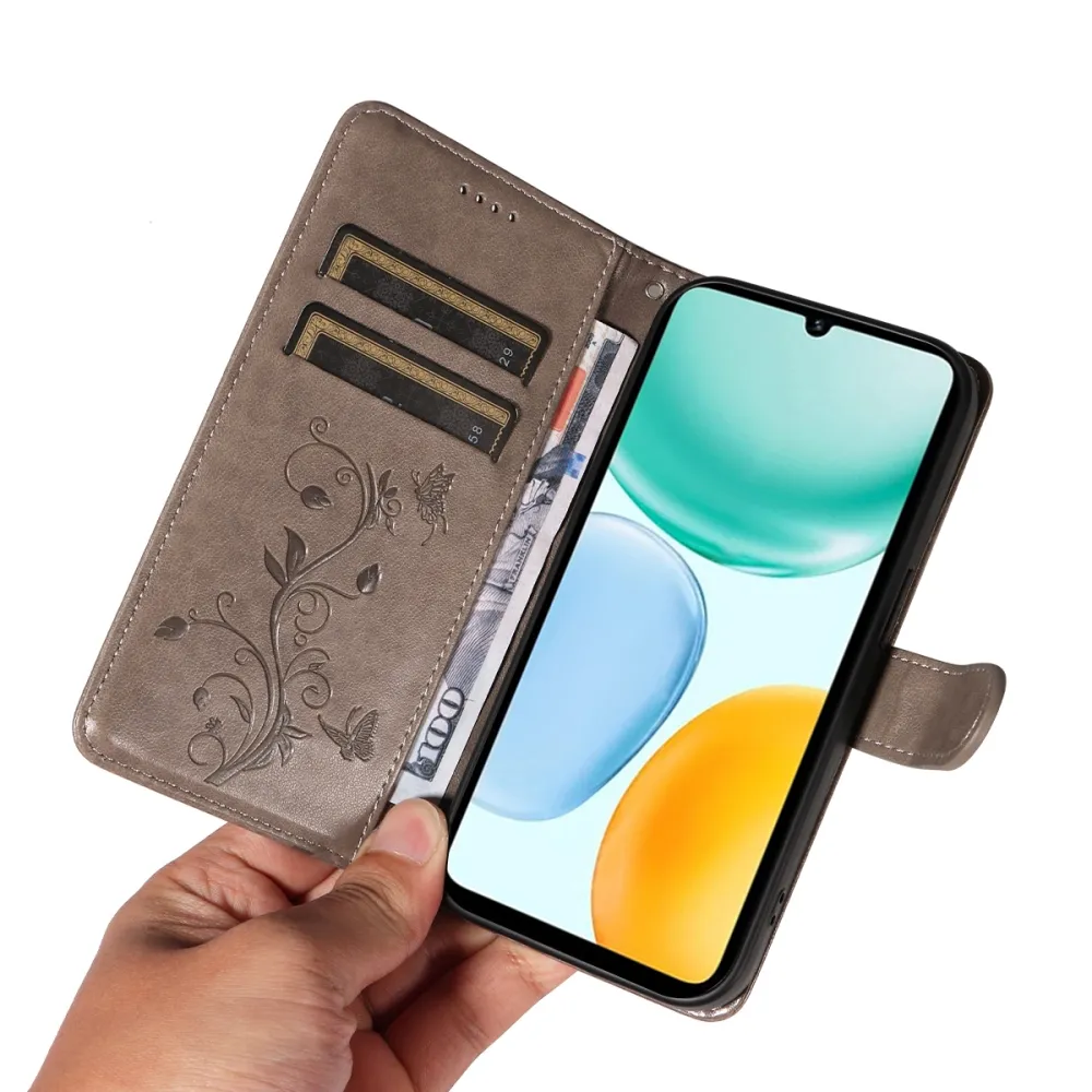 Šedé peněženkové pouzdro Flowers na mobil Honor X5c Plus