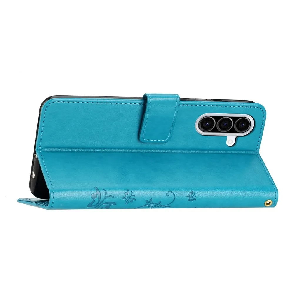Modré peněženkové pouzdro Flowers na mobil Samsung Galaxy A57 5G