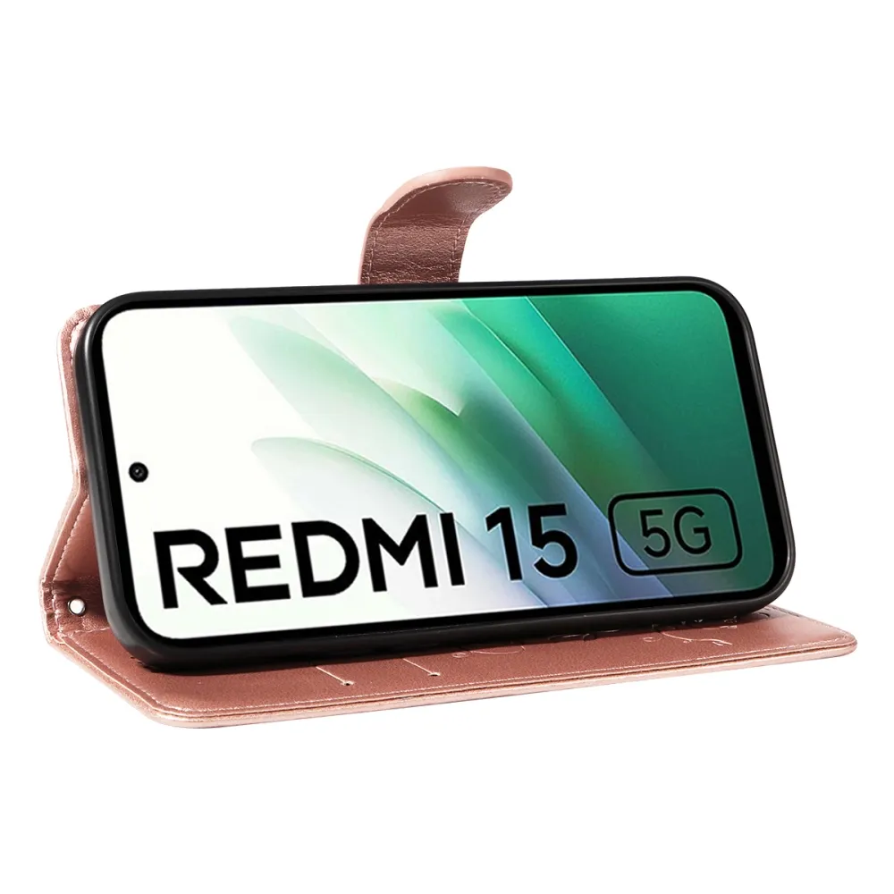 Růžovozlaté peněženkové pouzdro Flowers na mobil Xiaomi Redmi 15 5G (169mm)