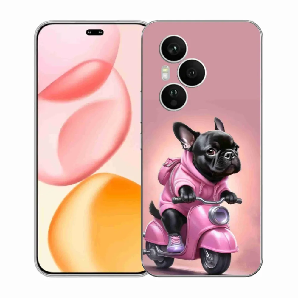 Psí pouzdro na Honor 400 Pro - francouzský buldoček na skútru poskytuje všechny výhody gelových obalů, a to v zajímavém designu.