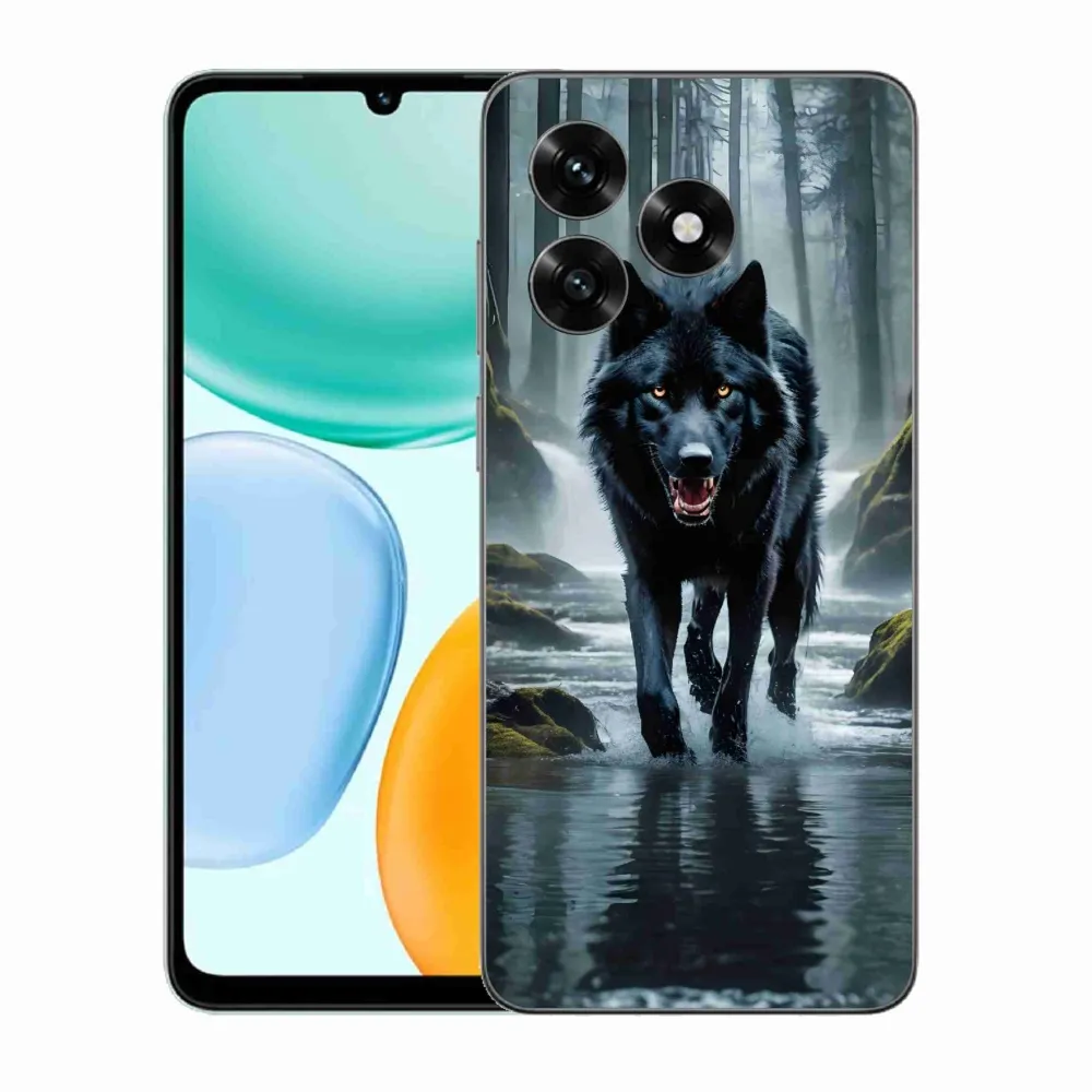 Pouzdro se šelmou na Honor X5c Plus - černý vlk poskytuje všechny výhody gelových krytů, a to v zajímavém designu.