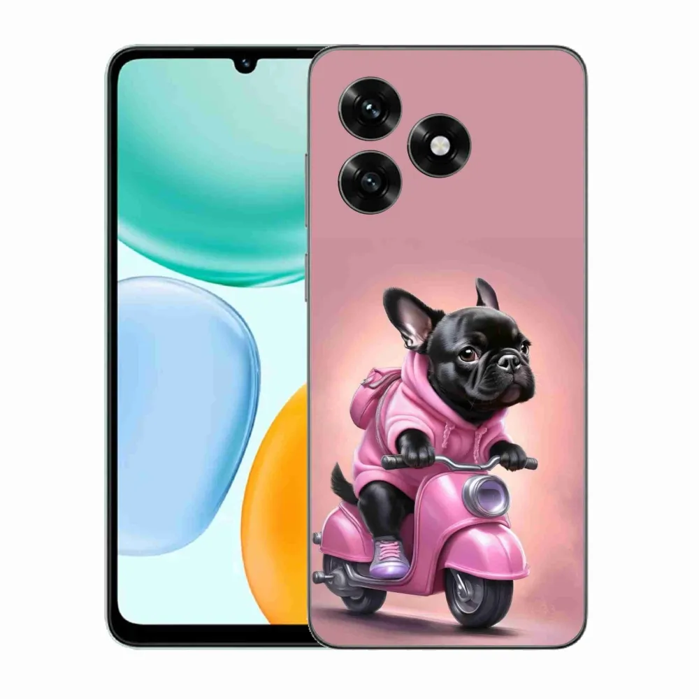 Psí pouzdro na Honor X5c Plus - francouzský buldoček na skútru poskytuje všechny výhody gelových obalů, a to v zajímavém designu.