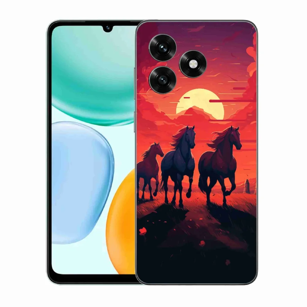 Pouzdro s motivem koně na Honor X5c Plus - koně a západ slunce poskytuje všechny výhody gelových krytů, a to v zajímavém designu.