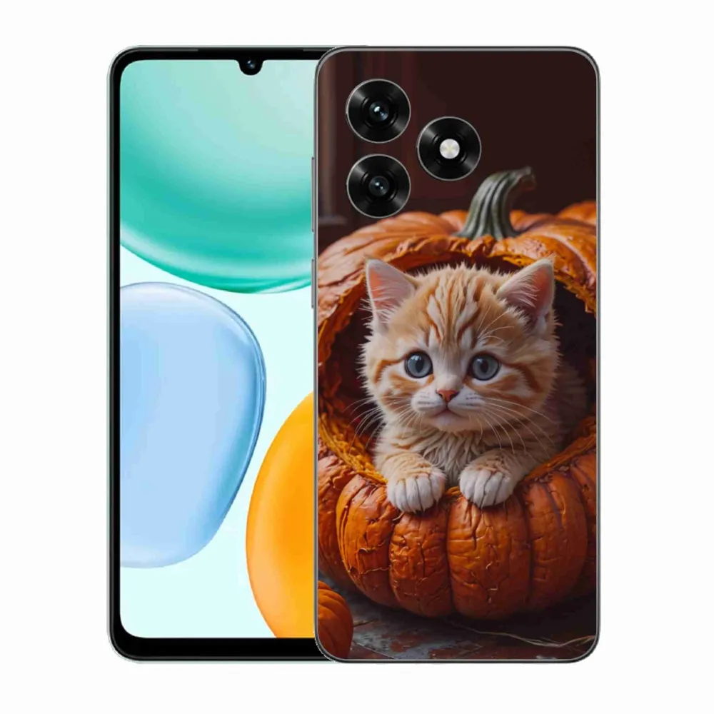 Kočičí pouzdro na Honor X5c Plus - kotě a dýně 2 poskytuje všechny výhody gelových obalů, a to v zajímavém designu.