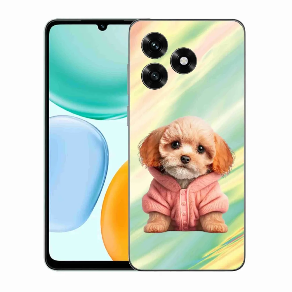 Psí pouzdro na Honor X5c Plus - štěně ve svetru poskytuje všechny výhody gelových obalů, a to v zajímavém designu.