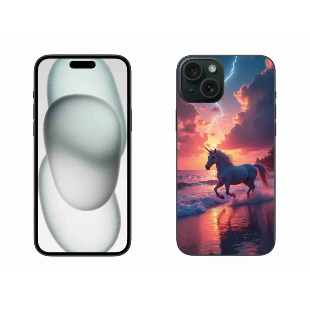 Pouzdro s motivem koně na iPhone 15 Plus - jednorožec na pláži poskytuje všechny výhody gelových krytů, a to v zajímavém designu.