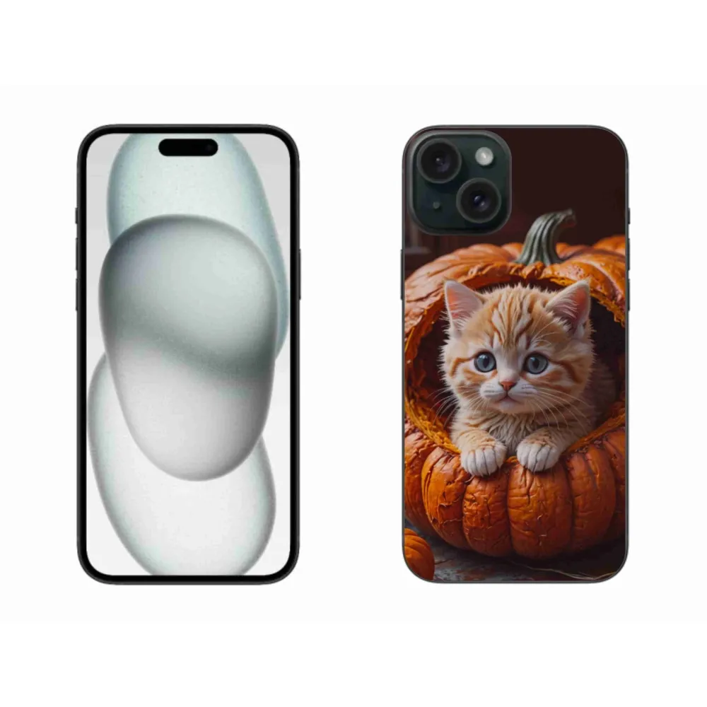 Kočičí pouzdro na iPhone 15 Plus - kotě a dýně 2 poskytuje všechny výhody gelových obalů, a to v zajímavém designu.