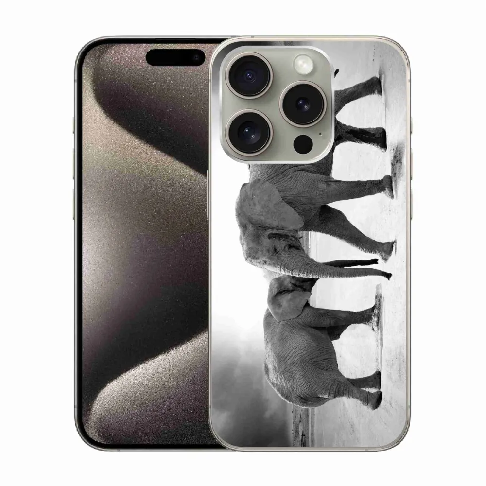 Zvířecí pouzdro na iPhone 15 Pro - černobílí sloni poskytuje všechny výhody gelových obalů, a to v zajímavém designu.