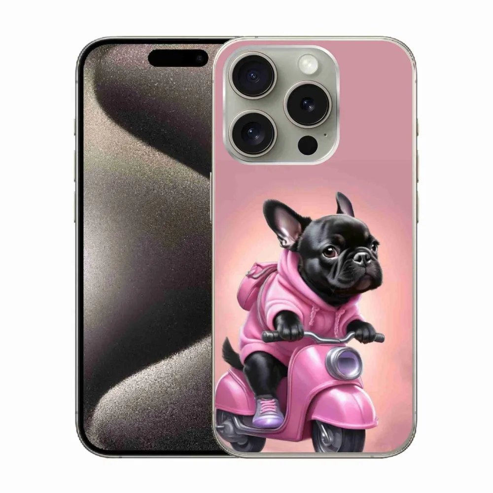 Psí pouzdro na iPhone 15 Pro - francouzský buldoček na skútru poskytuje všechny výhody gelových obalů, a to v zajímavém designu.