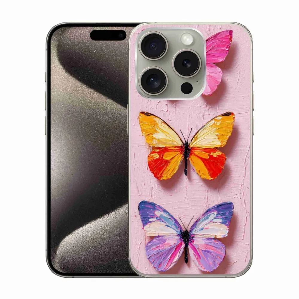 Zvířecí pouzdro na iPhone 15 Pro - motýlí trojice poskytuje všechny výhody gelových obalů, a to v zajímavém designu.