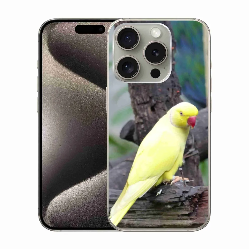 Ptačí pouzdro na iPhone 15 Pro - papoušek alexandr žlutý poskytuje všechny výhody gelových obalů, a to v zajímavém designu.