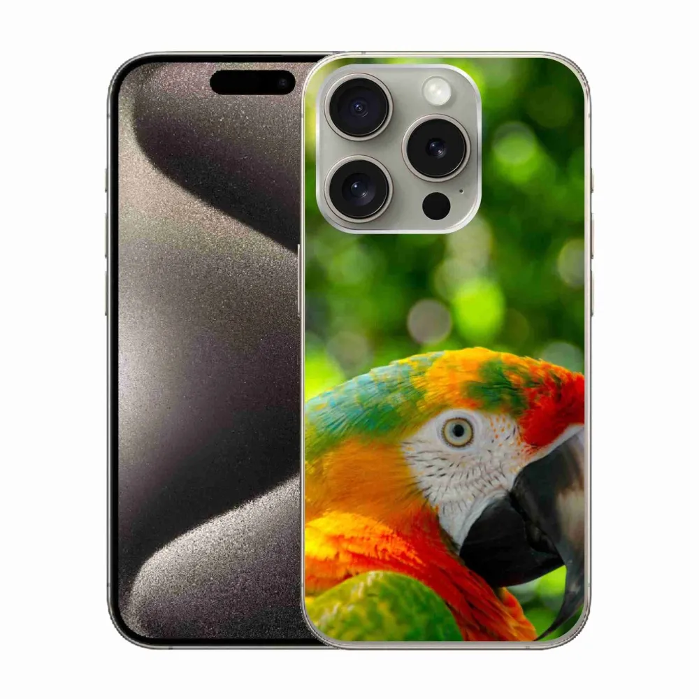 Ptačí pouzdro na iPhone 15 Pro - papoušek ara 3 poskytuje všechny výhody gelových obalů, a to v zajímavém designu.