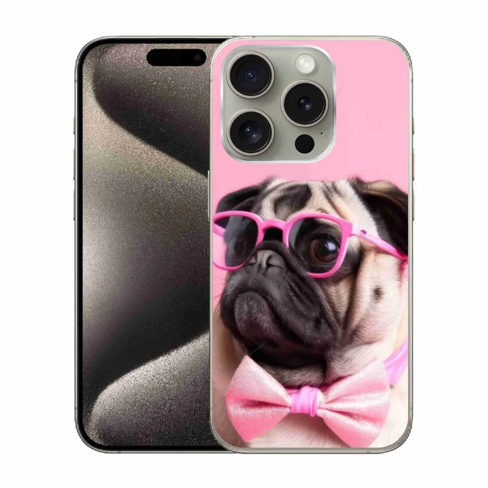 Psí pouzdro na iPhone 15 Pro - stylový mops poskytuje všechny výhody gelových obalů, a to v zajímavém designu.