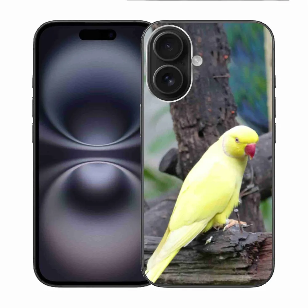 Pružný gelový obal mmCase s obrázkem na iPhone 16 - papoušek alexandr žlutý