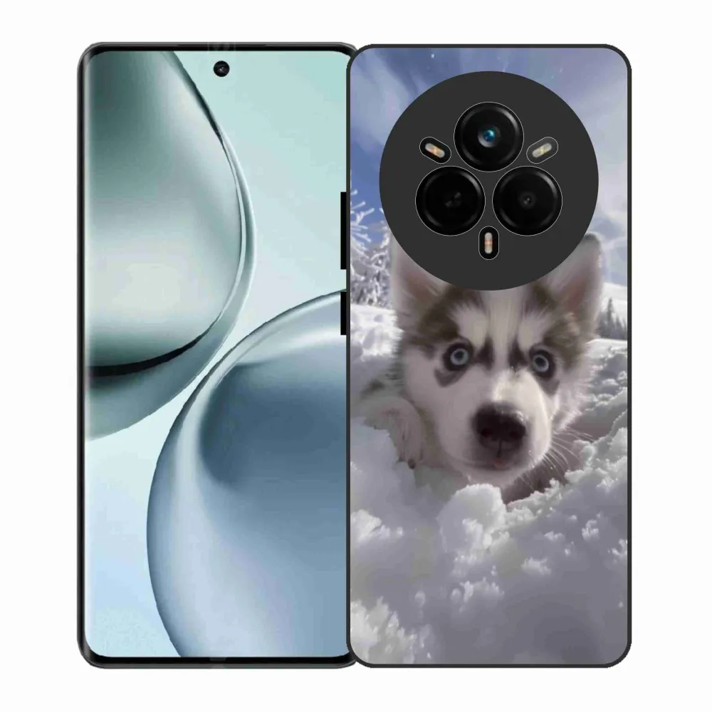 Psí pouzdro na Realme 14 Pro 5G - husky ve sněhu poskytuje všechny výhody gelových obalů, a to v zajímavém designu.