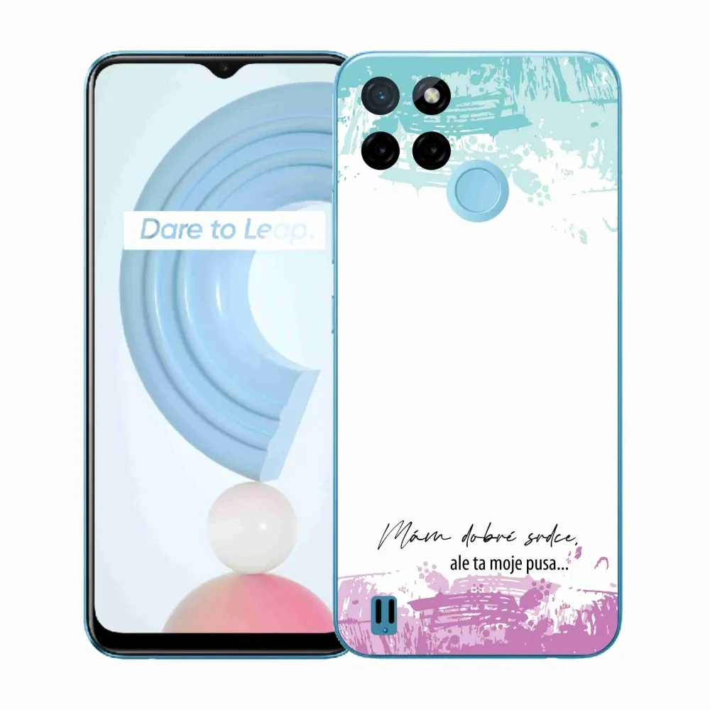 Pouzdro, na kterém je zajímavý text má název - vtipný text 3 bílé pozadí a je na Realme C21Y/C25Y poskytuje všechny výhody gelových krytů, a to v zajímavém designu.