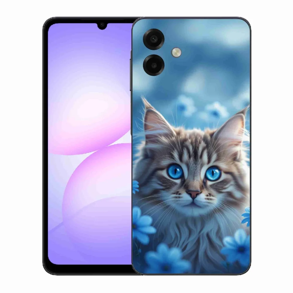 Kočičí pouzdro na Samsung Galaxy A07 - koťátko v modrých květech poskytuje všechny výhody gelových obalů, a to v zajímavém designu.