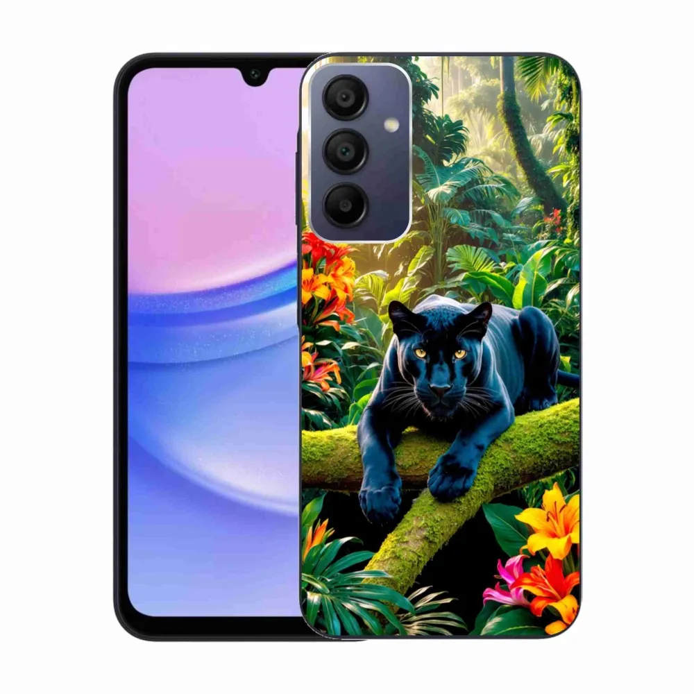 Zvířecí pouzdro na Samsung Galaxy A15/5G - černý panter v džungli poskytuje všechny výhody gelových obalů, a to v zajímavém designu.