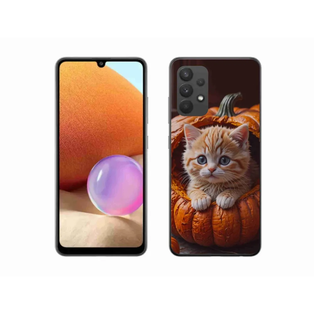 Kočičí pouzdro na Samsung Galaxy A32 4G - kotě a dýně 2 poskytuje všechny výhody gelových obalů, a to v zajímavém designu.
