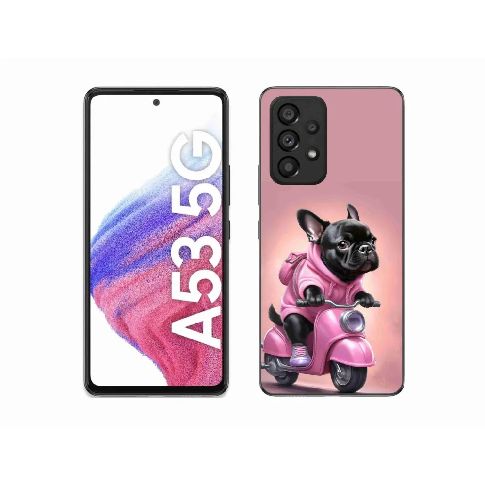 Psí pouzdro na Samsung Galaxy A53 - francouzský buldoček na skútru poskytuje všechny výhody gelových obalů, a to v zajímavém designu.