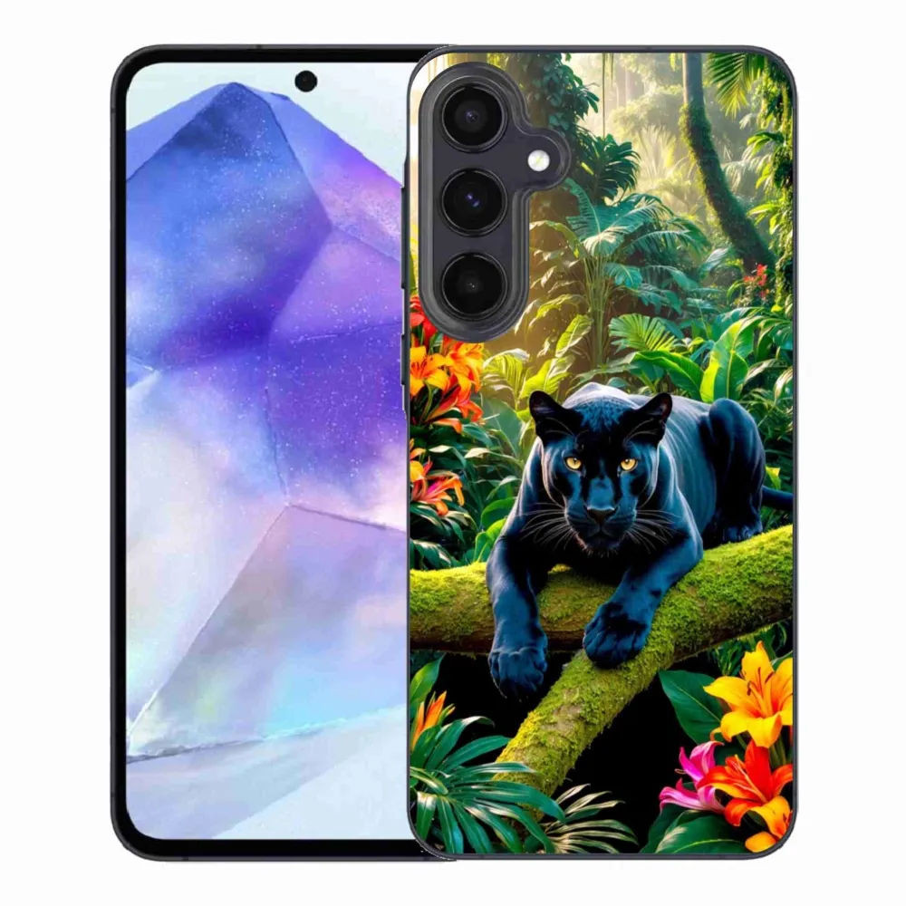 Zvířecí pouzdro na Samsung Galaxy A55 5G - černý panter v džungli poskytuje všechny výhody gelových obalů, a to v zajímavém designu.