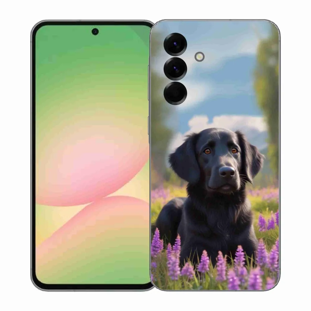 Psí pouzdro na Samsung Galaxy A57 5G - elegantní černý retrívr poskytuje všechny výhody gelových obalů, a to v zajímavém designu.