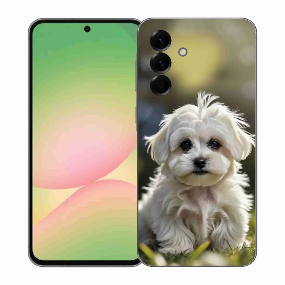 Psí pouzdro na Samsung Galaxy A57 5G - roztomilý maltézský psík poskytuje všechny výhody gelových obalů, a to v zajímavém designu.