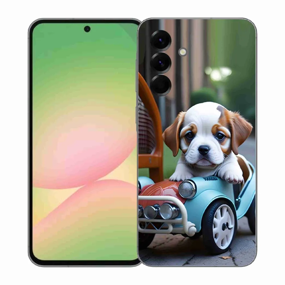 Psí pouzdro na Samsung Galaxy A57 5G - štěně v retro autě poskytuje všechny výhody gelových obalů, a to v zajímavém designu.
