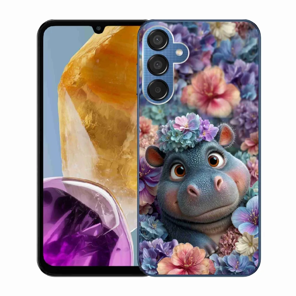 Zvířecí pouzdro na Samsung Galaxy M15 5G - hrošík v květinách poskytuje všechny výhody gelových obalů, a to v zajímavém designu.