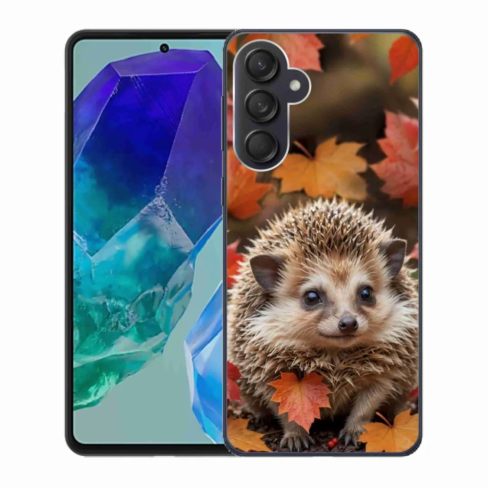 Zvířecí pouzdro na Samsung Galaxy M55 5G - ježek v listí poskytuje všechny výhody gelových obalů, a to v zajímavém designu.