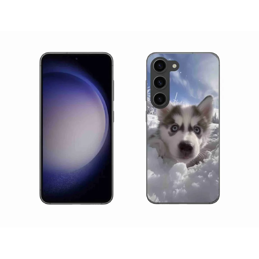 Psí pouzdro na Samsung Galaxy S23 5G - husky ve sněhu poskytuje všechny výhody gelových obalů, a to v zajímavém designu.