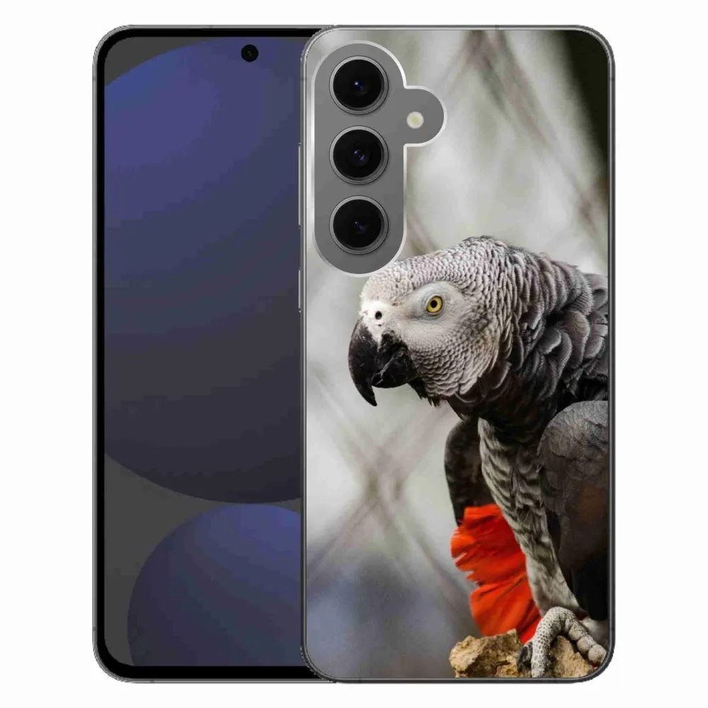 Ptačí pouzdro na Samsung Galaxy S24 FE - papoušek žako 3 poskytuje všechny výhody gelových obalů, a to v zajímavém designu.