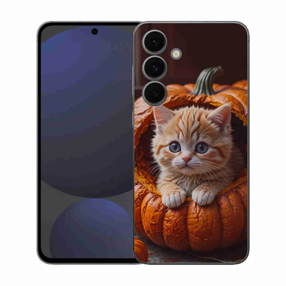 Pružný gelový obal mmCase s obrázkem na Samsung Galaxy S25 FE - kotě a dýně 2