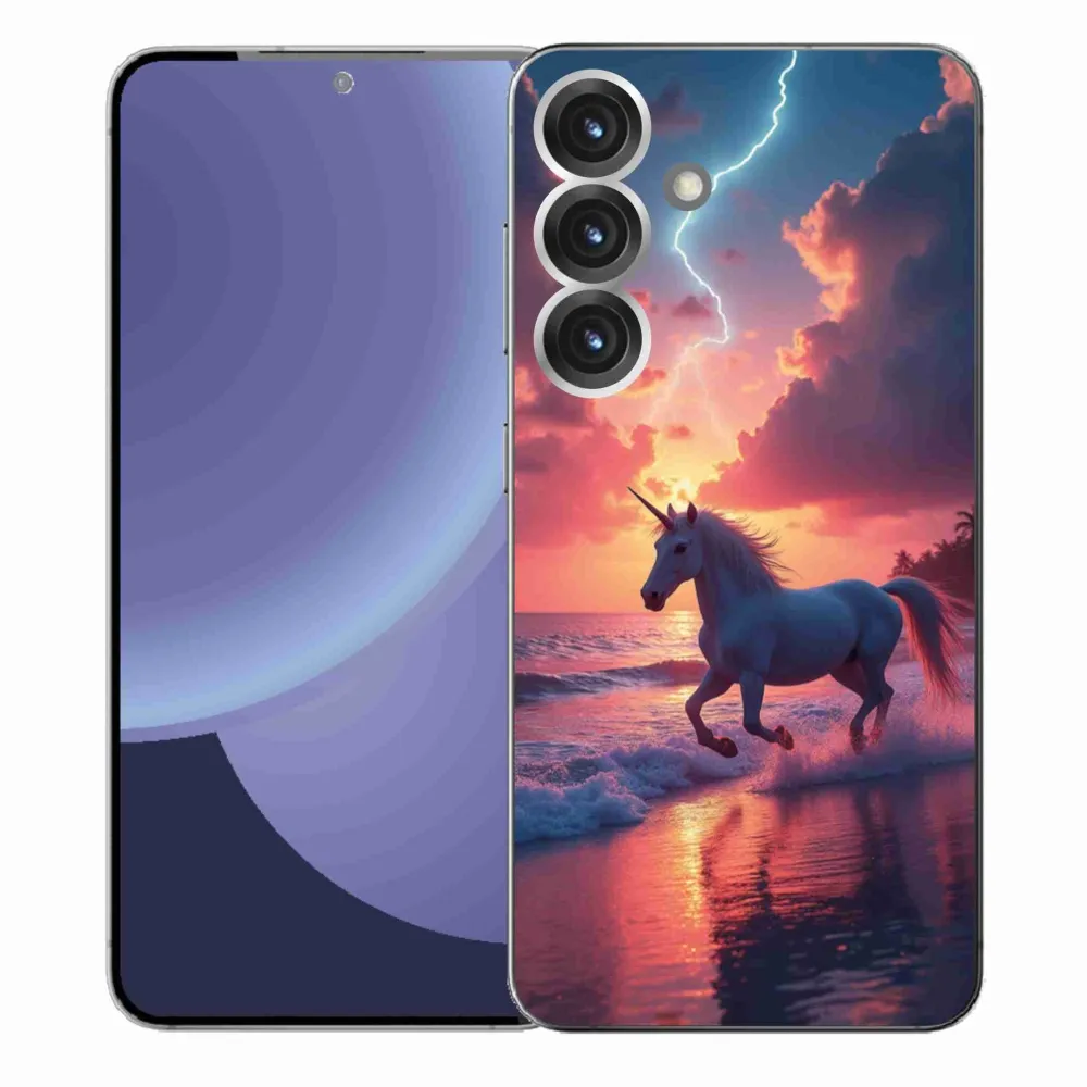 Pouzdro s motivem koně na Samsung Galaxy S25+ - jednorožec na pláži poskytuje všechny výhody gelových krytů, a to v zajímavém designu.
