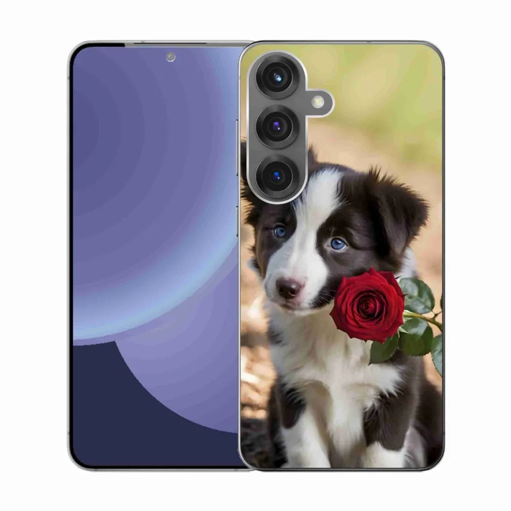 Psí pouzdro na Samsung Galaxy S25 - roztomilá border kolie s růží poskytuje všechny výhody gelových obalů, a to v zajímavém designu.