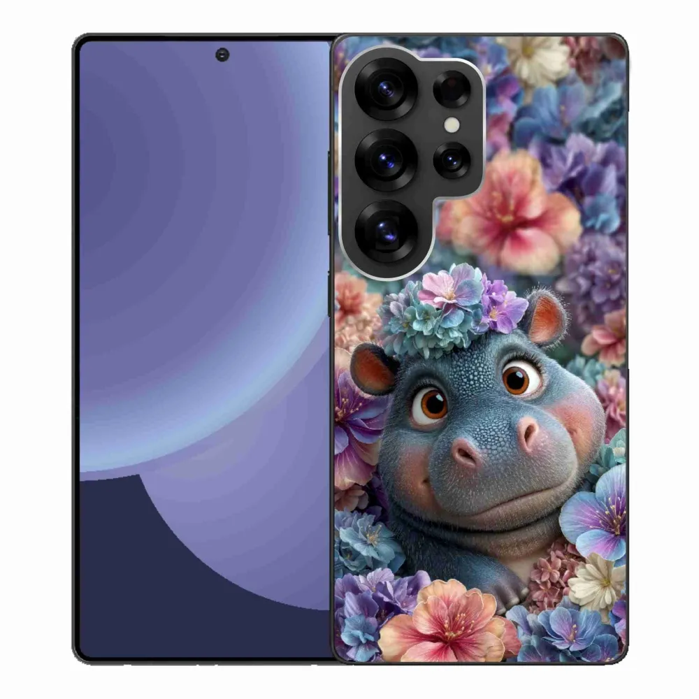 Zvířecí pouzdro na Samsung Galaxy S25 Ultra - hrošík v květinách poskytuje všechny výhody gelových obalů, a to v zajímavém designu.