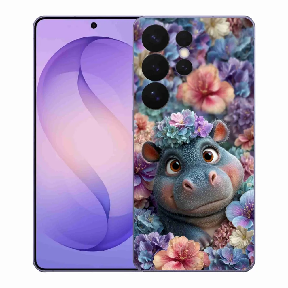 Zvířecí pouzdro na Samsung Galaxy S26 Ultra - hrošík v květinách poskytuje všechny výhody gelových obalů, a to v zajímavém designu.