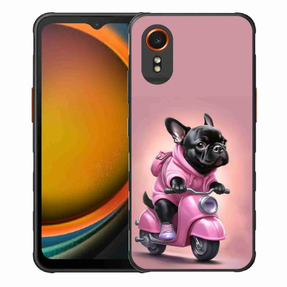 Psí pouzdro na Samsung Galaxy Xcover 7 - francouzský buldoček na skútru poskytuje všechny výhody gelových obalů, a to v zajímavém designu.