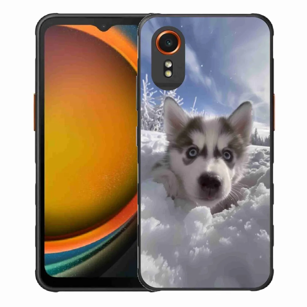 Psí pouzdro na Samsung Galaxy Xcover 7 - husky ve sněhu poskytuje všechny výhody gelových obalů, a to v zajímavém designu.