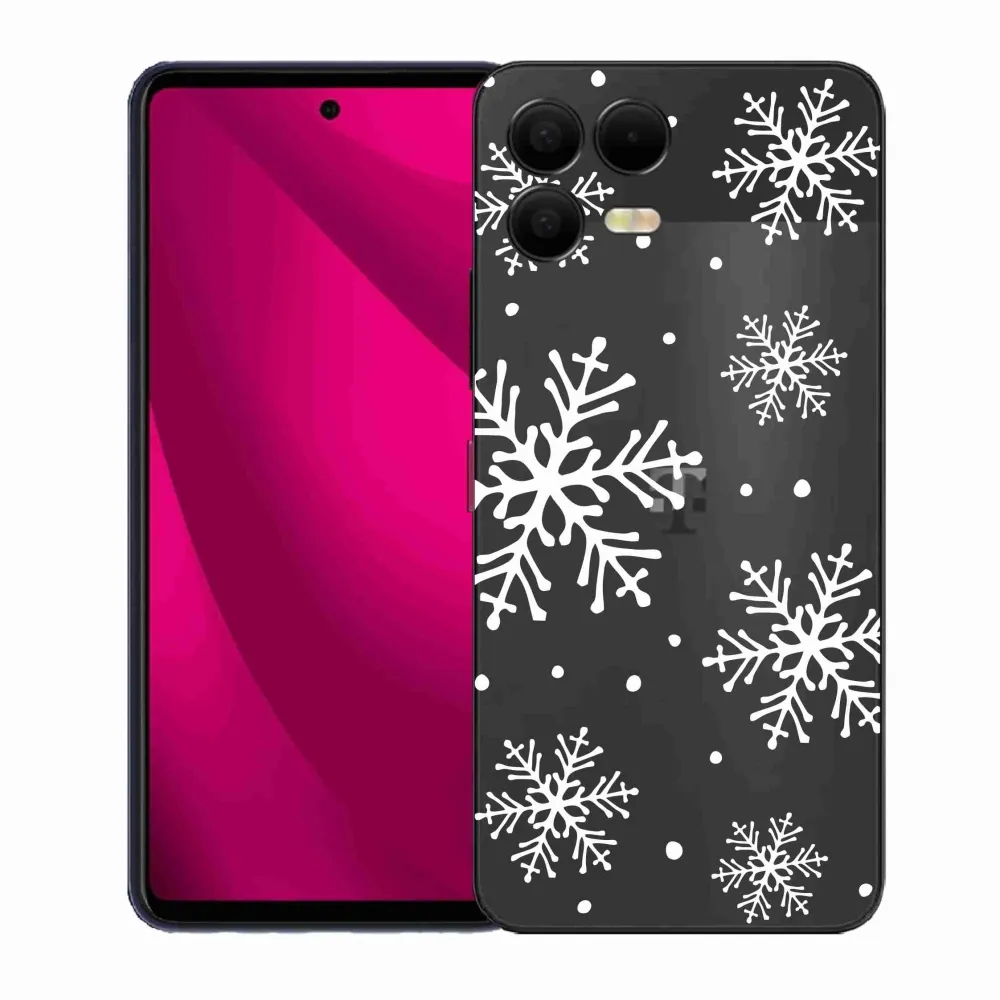 Vánoční pouzdro na T-Mobile T Phone 3 Pro - bílé vločky (pozadí krytu je průhledné) poskytuje všechny výhody gelových krytů, a to v zajímavém designu.