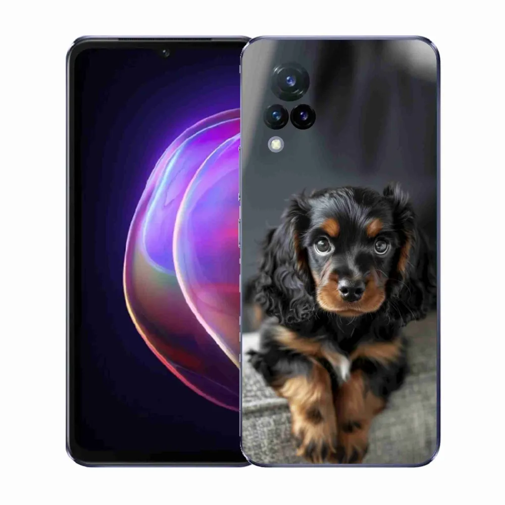 Psí pouzdro na Vivo V21 4G/5G - roztomilý dlouhosrstý jezevčík poskytuje všechny výhody gelových obalů, a to v zajímavém designu.