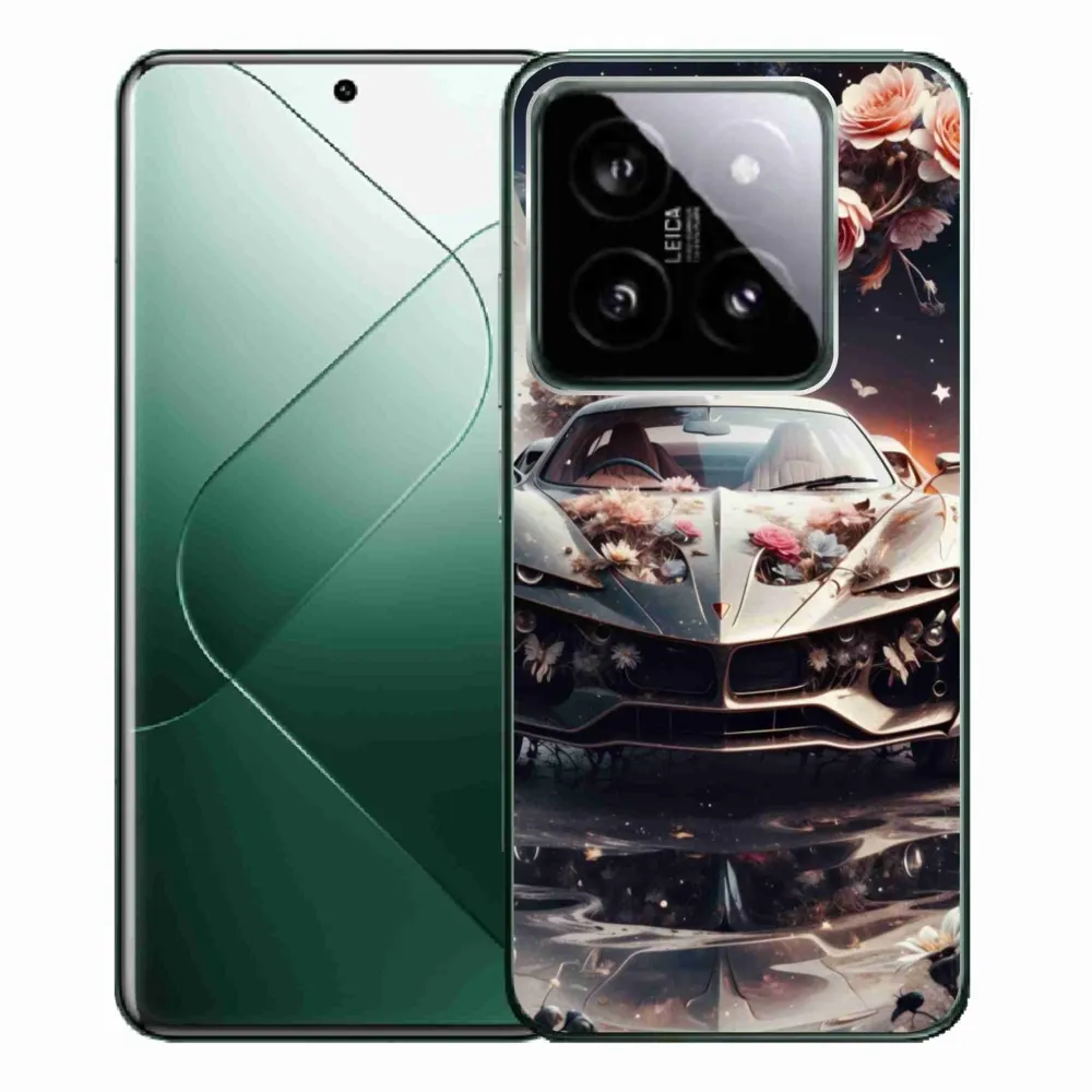 Pouzdro na Xiaomi 14 Pro - květinový sportovní vůz poskytuje všechny výhody gelových obalů, a to v zajímavém designu.
