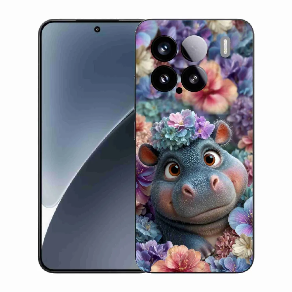 Zvířecí pouzdro na Xiaomi 15 - hrošík v květinách poskytuje všechny výhody gelových obalů, a to v zajímavém designu.