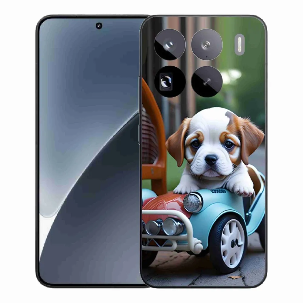 Psí pouzdro na Xiaomi 15 Pro - štěně v retro autě poskytuje všechny výhody gelových obalů, a to v zajímavém designu.