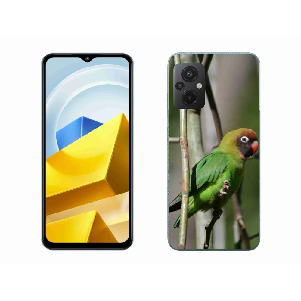 Ptačí pouzdro na Xiaomi Poco M5 4G - papoušek agapornis poskytuje všechny výhody gelových obalů, a to v zajímavém designu.