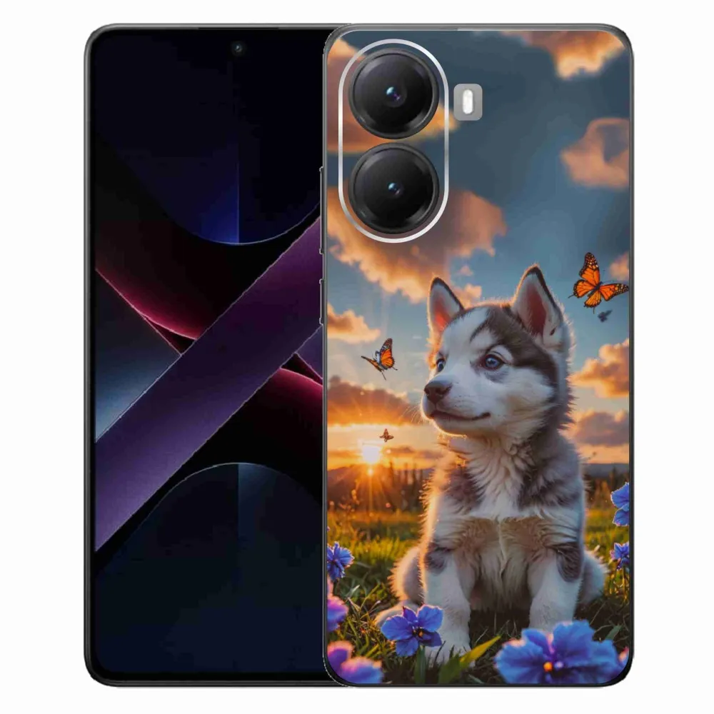 Psí pouzdro na Xiaomi Poco X7 Pro 5G - husky při západu slunce poskytuje všechny výhody gelových obalů, a to v zajímavém designu.